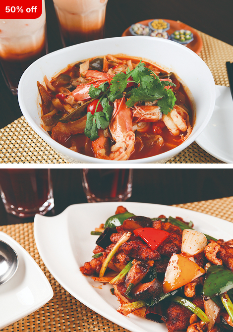 하우스 와인 또는 아이스티 – 똠얌꿍 – 솜땀 – 새우팟타이 – 게야채볶음커리 – 치킨캐슈너트볶음 – 공깃밥 – 디저트(사쿠)